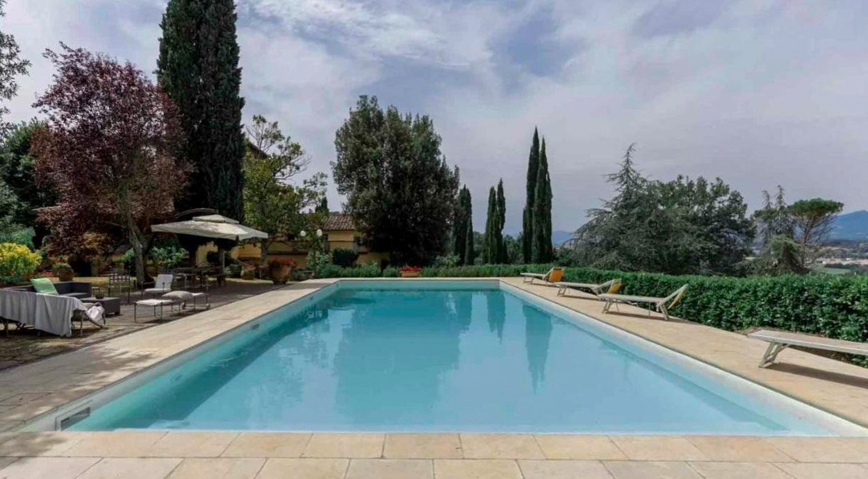El jardín a la italiana, con árboles centenarios, rosales y setos, da paso a un parque privado con senderos, praderas y zonas de sombra. La piscina panorámica funciona como terraza natural con vistas al paisaje ondulado del Mugello, ideal para disfrutar del verano.