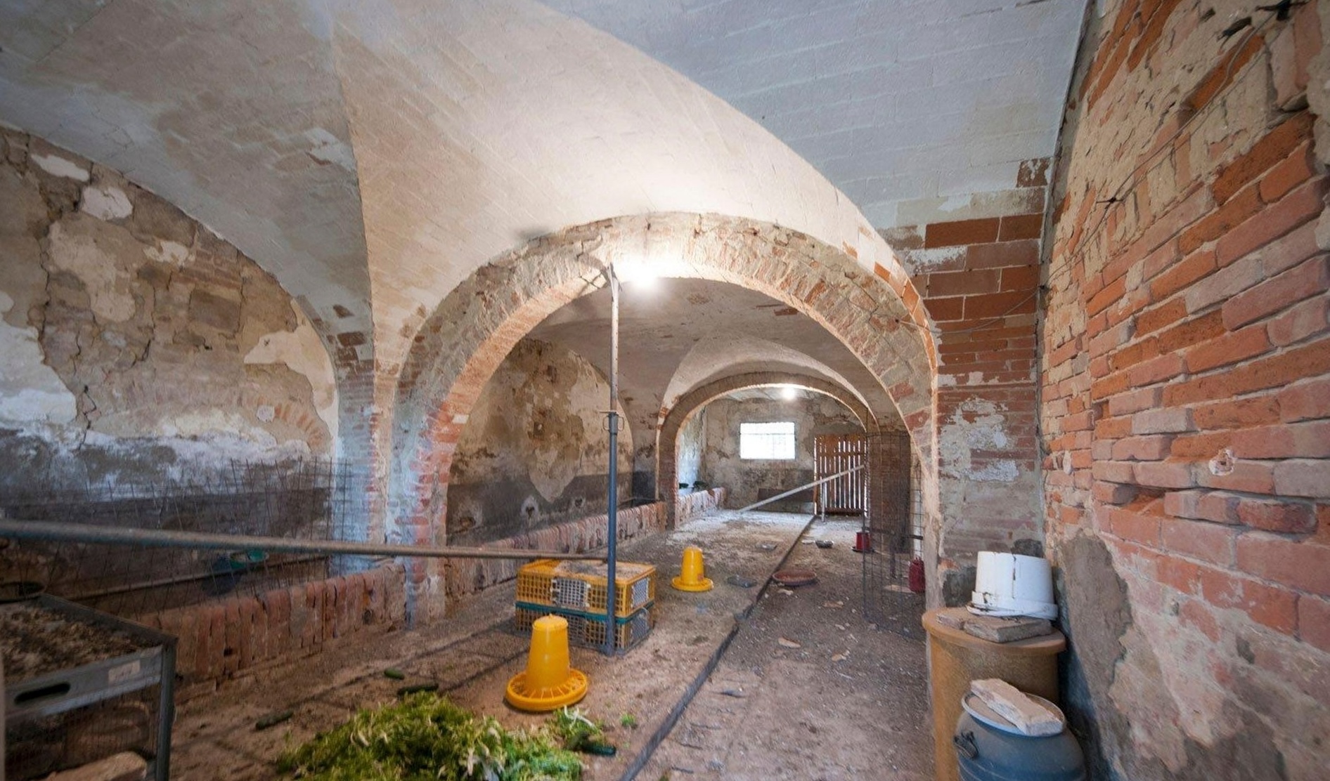 El edificio principal, de dos plantas, conserva su carácter histórico: suelos de terracota, techos abovedados y bodegas originales con antiguos barriles de vino. Una parte ya restaurada ofrece un apartamento con salón comedor, chimenea, cocina con horno de leña, dos habitaciones y un baño. El resto requiere renovación, ofreciendo un amplio potencial de personalización.